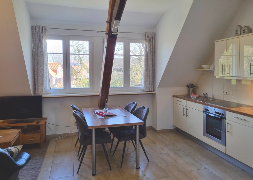 vollausgestattete Küchenzeile und Esstisch und Wohnbereich mit Couchecke mit TV
